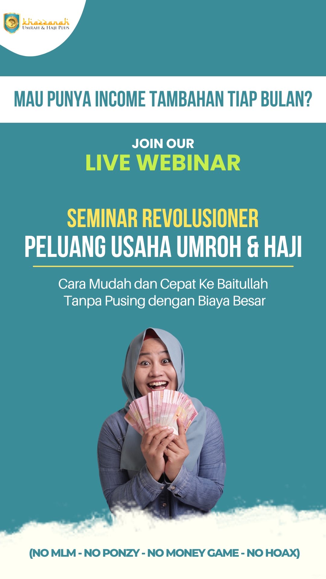 Dalam seminar ini akan dibongkar habis rahasia agar Anda bisa berangkat umroh secara GRATIS bahkan bisa memberangkatkan orang tua, mertua dan keluarga tercinta Anda secara Gratis. Bukan hanya dapat gratis umroh, Anda pun akan mendapatkan komisi besar sebagai income tambahan untuk memenuhi kebutuhan Keluarga Anda.