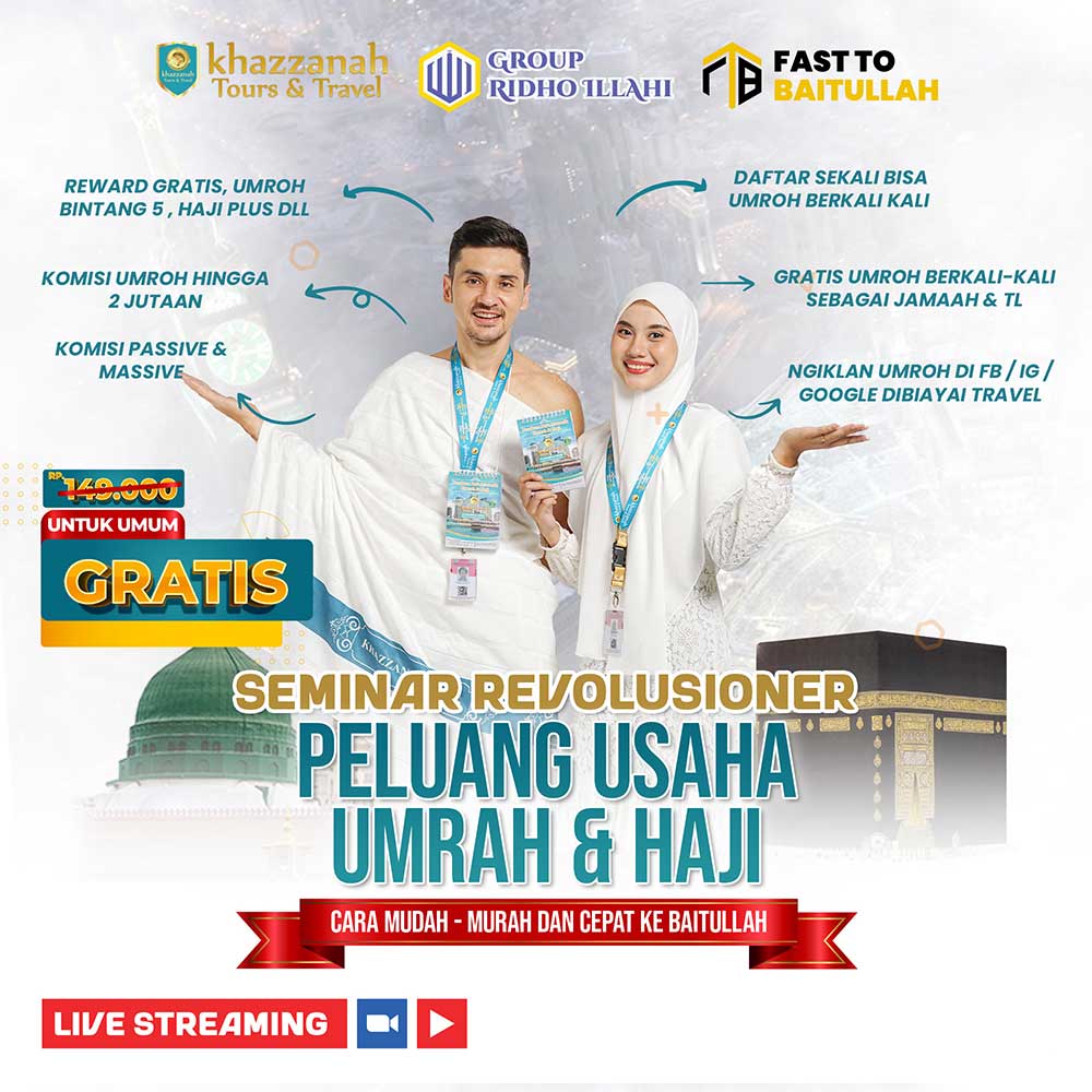 Anda dapat mengikuti acara Seminar Peluang Usaha Umroh Haji Tanpa Mengeluarkan Biaya Sepeserpun, Alias…
